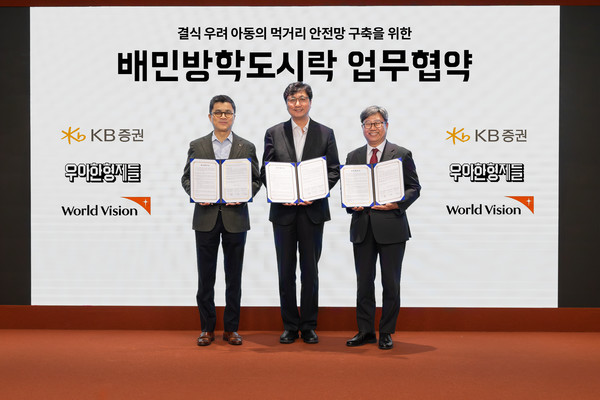 업무협약식에는 함윤식 우아한형제들 고객중심경영부문장(부사장), 강진두 KB증권 경영지원부문장(부사장), 한상호 월드비전 CMO(최고마케팅책임자) 등이 참석해 배민방학도시락 사업 관련 협약을 체결했다.