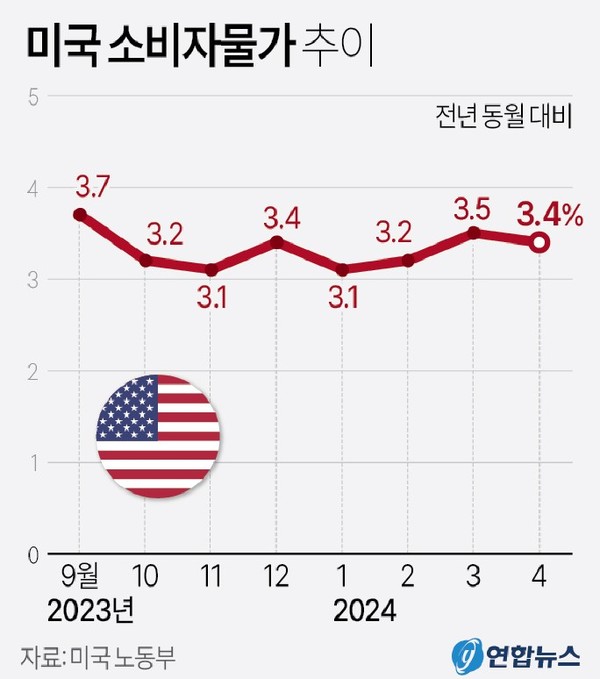 미 노동부는 15일(현지시간) 지난달 소비자물가지수(CPI)가 지난해 동월 대비 3.4% 상승했다고 밝혔다. 이는 전월 대비 0.1%포인트 감소한 것으로 올해 들어 처음 상승세가 완화했다.