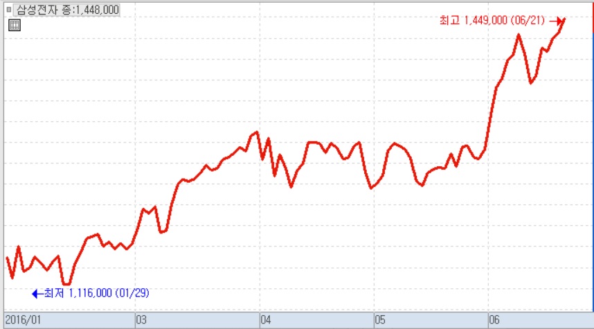 대장주 삼성전자가 고공행진을 거듭하고 있다. 코스피지수가 브렉시트(영국의 유럽연합 탈퇴) 우려로 고전하는 가운데 삼성전자는 상승곡선으로 신고가를 갈아치우는 중이다. 메모리 반도체 가격이 상승세로 돌아선데다 2분기 호실적 발표에 대한 기대감이 주가를 견인하고 있다.