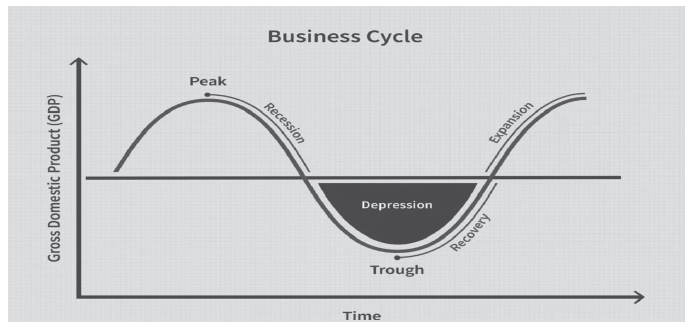 한 나라의 국내총생산(GDP)은 계속 늘어나는 확장(expansion) 국면에서 정점(peak)에 도달하면 다시 쪼그라드는 '경기후퇴'(recession), 즉 침체가 일어난다. 경기가 마침내 저점(trough)에서 바닥을 치고 회복 국면에 들어서면 경기확장이 재개된다.