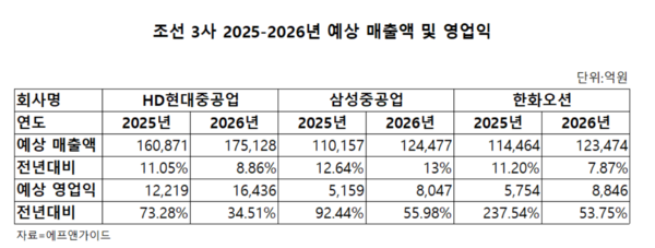 증권업계는 이들 조선 3사의 향후 실적 또한 우상향 할 것으로 전망 중이다. 증권사 세 곳 이상이 전망한 HD현대중공업의 올해 매출 평균치는 16조871억원, 영업이익 1조2219억원으로 매출은 11.05%가, 영업익은 73.28%가 늘어날 것으로 전망했다. 또 2026년 예상 매출액과 영업익은 각각 전년 대비 8.86%, 34.51% 늘어난 17조5128억원, 1조6436억원으로 증가세가 이어질 것으로 봤다.