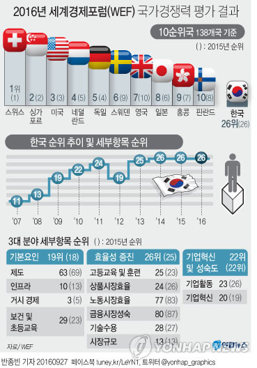 세계경제포럼(WEF)이 매년 발표하는 국가경쟁력 평가 결과에서 한국이 138개국 중 26위를 차지했다. 이는 2014년, 2015년에 이은 3년 연속 최저 순위다.